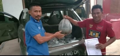 Kepala Desa Bima Maroa (kiri) saat menerima bibit ikan lele dari penangkar